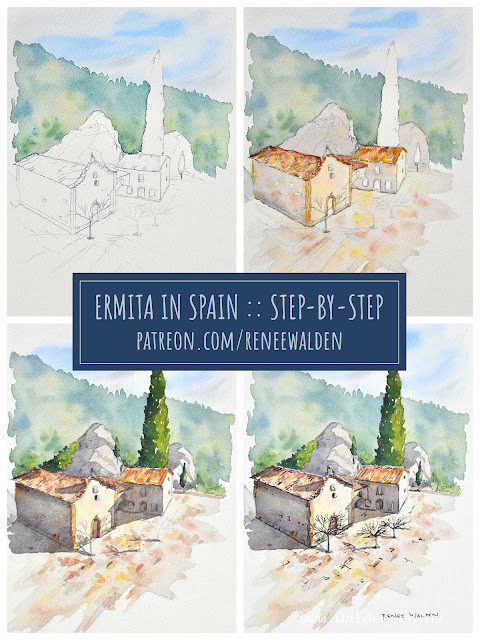 And yet, there's always a surprise of a new view. One evening recently we scrambled up one of the boulders to view the ermita from above. What a wonderful surprise to be seeing it from such an unusual angle and to view some of the tops of the cypresses too. So I was back first thing the next morning to perch in the same spot, with paper and paints in my bag.