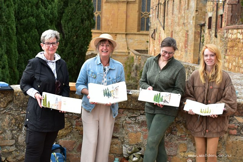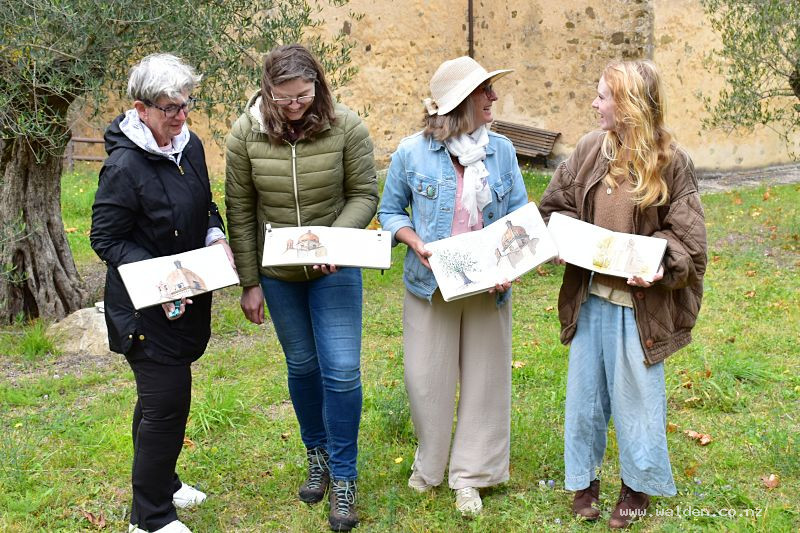We spent our final morning sitting among old olive trees, sketching the Tuscan domes and church towers of Seggiano. It may have looked complicated, but everyone created beautiful, personal sketches.