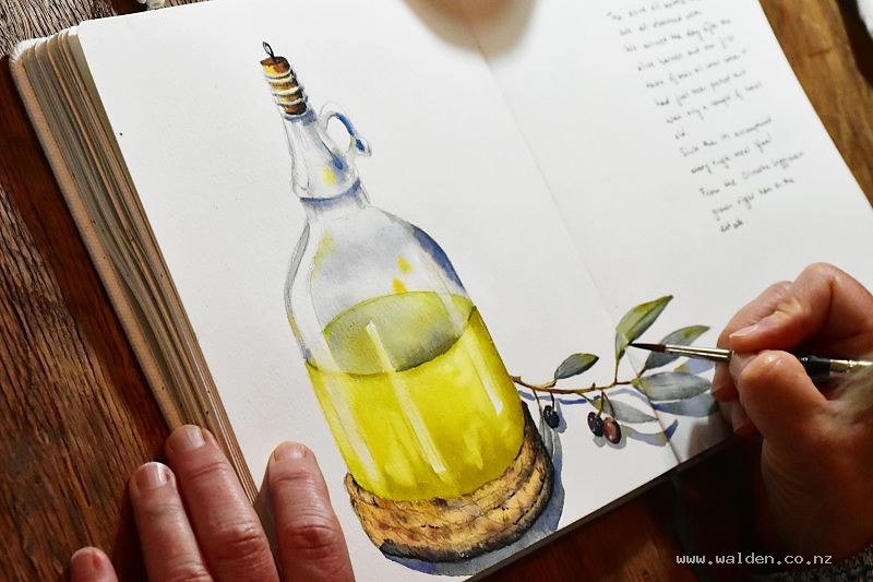I don’t think I’ve ever done a still life on a retreat before, but it was such fun. We set up a table in the studio with the bottle and some olive branches I picked just outside. Then it was all about painting glass, reflections, and capturing that exact colour of the oil — liquid gold. It was an incredibly joyful morning.