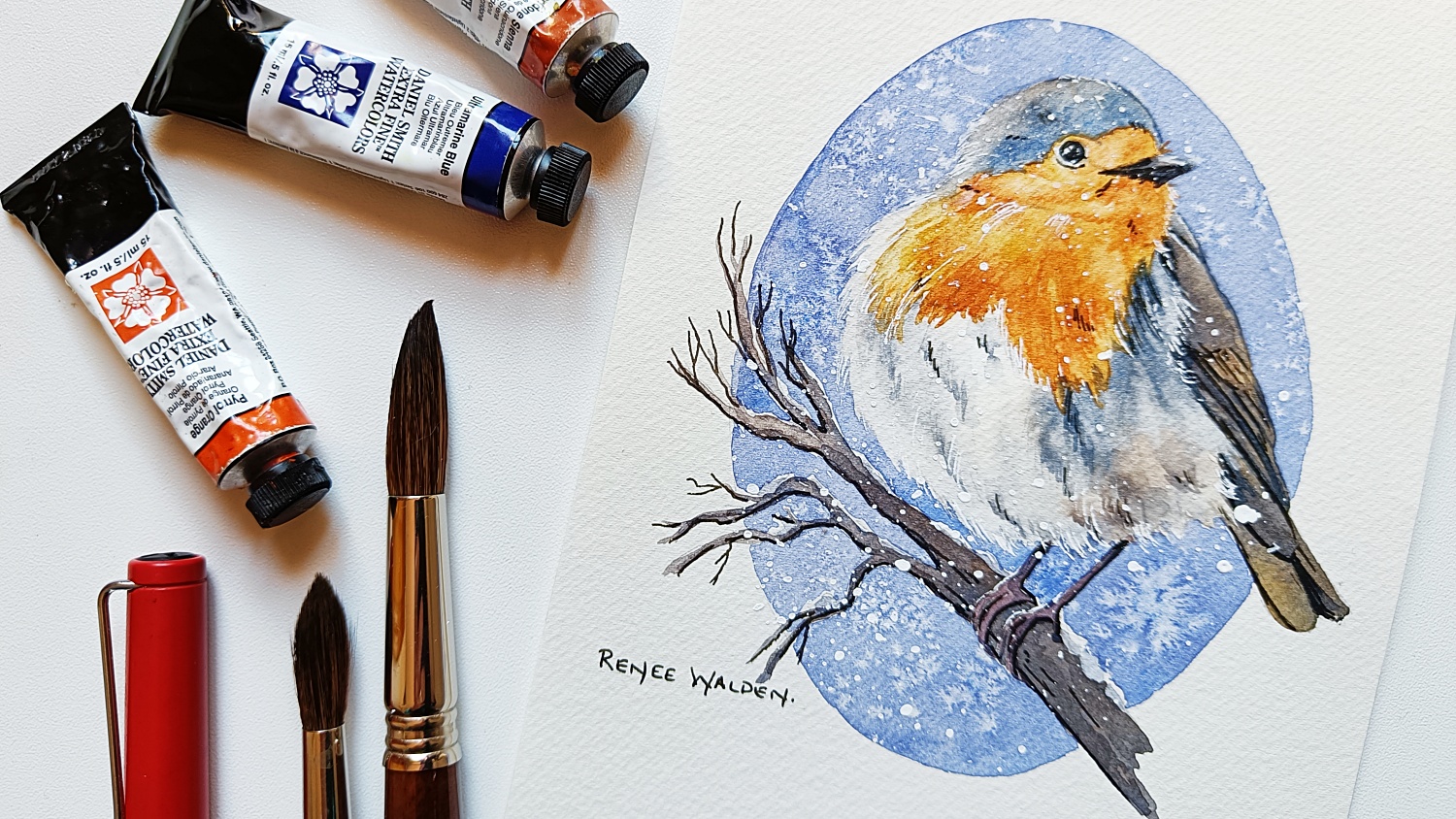 Painting with the board at a slight angle — rather than flat — helps in several ways: it protects your neck, the natural downward flow of water creates ease when painting washes, and paint dries more evenly from top to bottom. A simple piece of wood, 2-3cm high, under one edge is all it takes.