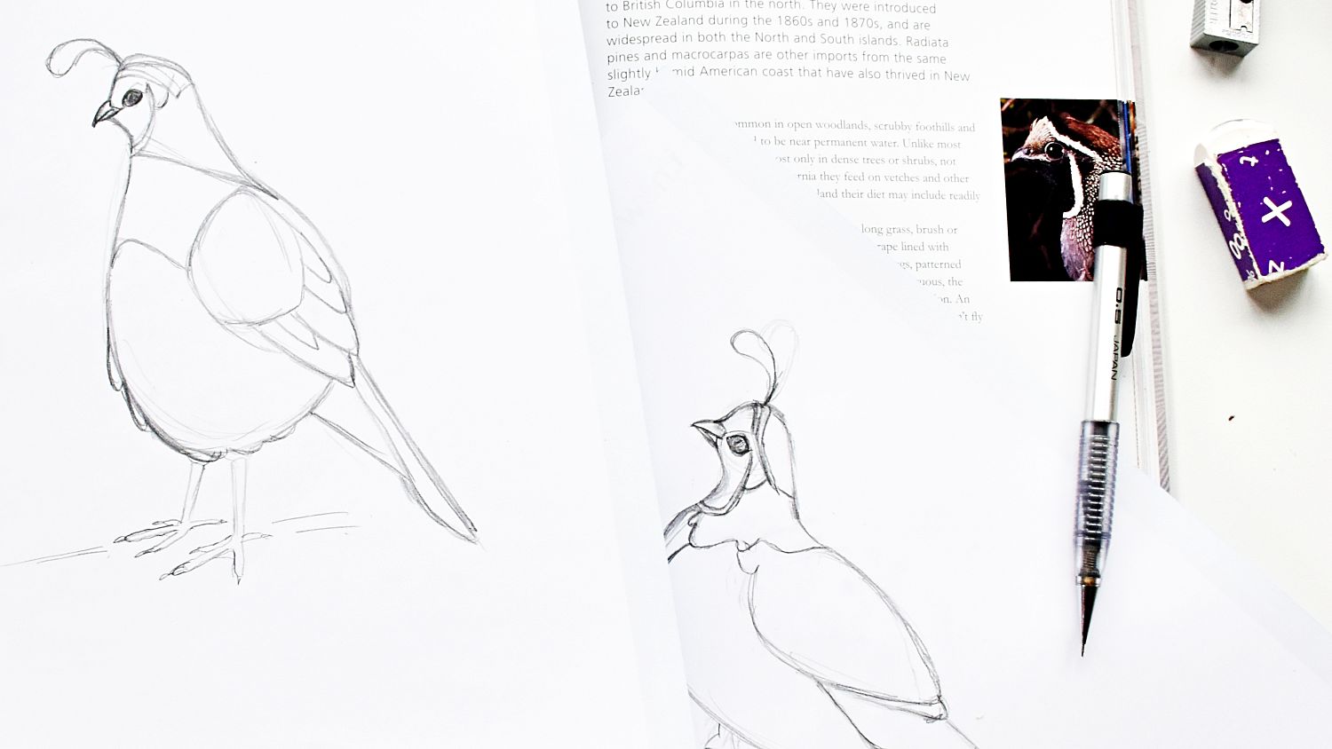 - For a sketchbook spread, plan the composition across both pages - for example where you'll put your main subject, what other vignettes you'll add, headings and notes.